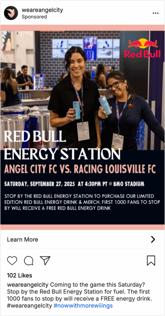 Fans can expect to see more of Red Bull throughout the season at BMO Stadium. Red Bull will be launching an exclusive drink flavor only available at BMO Stadium during Angel City FC games this season. At select games, Red Bull will be bringing their Red Bull Energy Station, the first one launching at the Angel City FC versus the Racing Louisville FC match on September 27. At these stations, fans will be able to taste test flavors, receive free Red Bull drinks, and purchase limited edition Red Bull x Angel City FC merch. More details will be announced soon.
